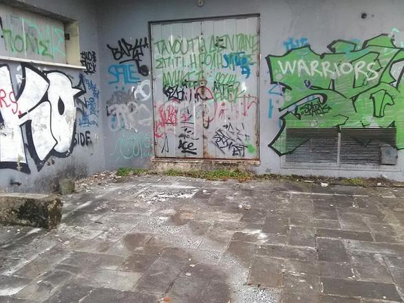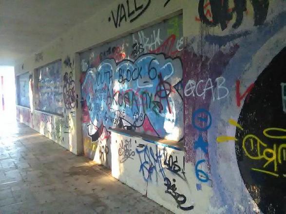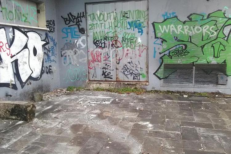 Ο εσωτερικός χώρος έχει σφραγιστεί αλλά τριγύρω υπάρχουν παντού συνθήματα και υπολείμματα φωτιάς. Ένα διαλυμένο αυτοκίνητο, τοίχο μισογκρεμισμένοι. Και κυρίως ασχήμια κι ερημιά. Οι εικόνες θυμίζουν πραγματικά πόλη που ερημώθηκε από πόλεμο και το φοβερό είναι ότι δεν ενοχλούν κάποιον να κάνει κάποια προσωρινή έστω παρέμβαση, όπως ένα βάψιμο.