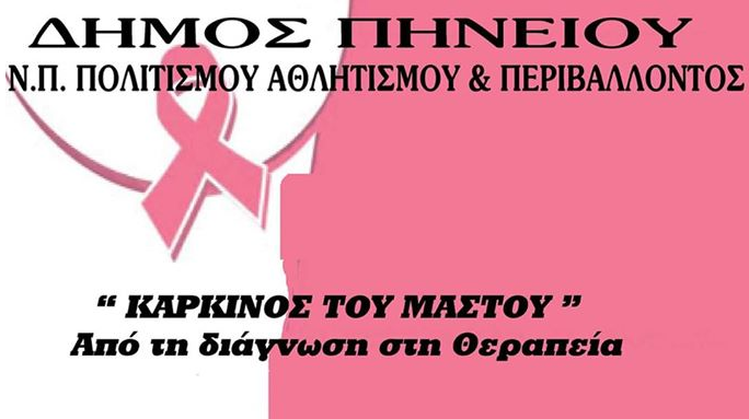 «Καρκίνος του μαστού – Από τη διάγνωση στη θεραπεία» είναι το θέμα της επιστημονικής εκδήλωσης που διοργανώνει το Νομικό Πρόσωπο Πολιτισμού. Αθλητισμού και Περιβάλλοντος του δήμου Πηνειού την ερχόμενη Παρασκευή, 6 Μαρτίου, στις 8 το βράδυ, στο Κουρβισιάνειο Πολιτιστικό Κέντρο Γαστούνης.