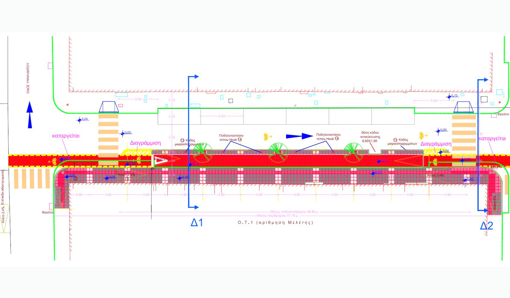 Επίσης σε όλες τις γωνίες των Ο.Τ. η διαμόρφωση των πεζοδρομίων είναι στο επίπεδο του οδοστρώματος για να γίνεται εύκολη η πρόσβαση των πεζών και των ΑΜΕΑ.