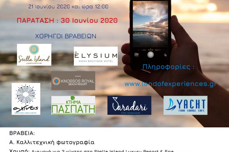 Ο διαγωνισμός ψηφιακής φωτογραφίας που έχει προκηρύξει η Αντιδημαρχία Τουρισμού Δήμου Χερσονήσου σε συνεργασία με την Ελληνική Φωτογραφική Εταιρεία Κρήτης (Ε.Φ.Ε.Κ.) παρατείνεται μέχρι τις 30 Ιουνίου 2020 (τελευταία ημέρα κατάθεσης συμμετοχής).