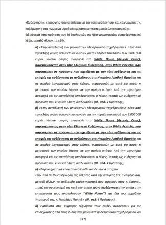 - «Την επόμενη ημέρα από την αποστολή των ανωτέρω μηνυμάτων ηλεκτρονικού ταχυδρομείου, που αναφέρονται σε “White House”, “White Porscha” και “φίλους” δήθεν της κυβέρνησης “με τραπεζικούς λογαριασμούς στα Ηνωμένα Αραβικά Εμιράτα”, το επίμαχο ποσό των 3.000.000 ευρώ εμβάσθηκε από offshore εταιρεία συμφερόντων του Ομίλου Χούρυ στο λογαριασμό έτερης εταιρείας του εν λόγω Ομίλου στην Ισλαμική Τράπεζα του Άμπου Ντάμπι (“ABU DHABI ISLAMIC BANK”), και εν συνεχεία από εκεί, μέσω μιας αγγλικής τράπεζας, στον τραπεζικό λογαριασμό της εταιρείας “ΤΟΞΟΤΗΣ” στην “Attica Bank”».