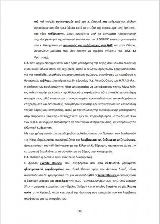 - «Από το από 06.05.2018 Ιδιωτικό Συμφωνητικό, που υπογράφεται από τους Σάμερ Χούρυ, Χρήστο Καλογρίτσα και Κυριάκο Τόμπρα [...] προκύπτει ότι το φερόμενο ως “δώρο” επίμαχο ποσό των 3 εκατ. ευρώ αποτέλεσε όχι μόνο αντικείμενο συζήτησης και διαπραγμάτευσης για τον τρόπο (και όχι για την υποχρέωση ή μη) επιστροφής του μεταξύ του καταβάλλοντος και του λαβόντος αυτό, και δη μέχρι και το 2018 [...], αλλά πολύ περισσότερο αντικείμενο συμφωνίας για τον τρόπο επιστροφής του».